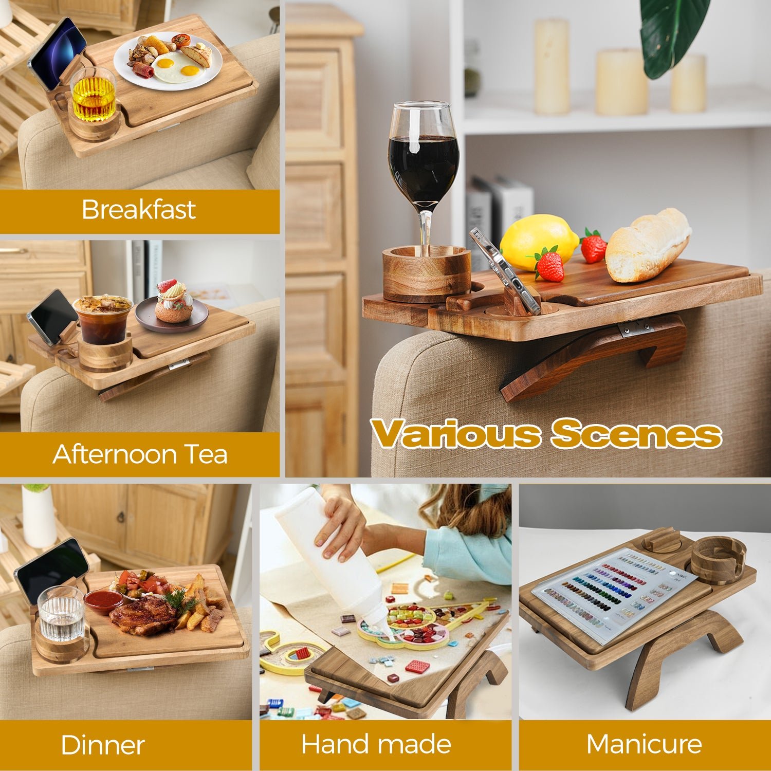 Multifunctional: This 4-in-1 couch arm table includes a 360° rotatable phone holder, cup holder, and a detachable wooden charcuterie board. The phone holder can be adjusted to any angle, the cup holder fits mugs or glasses, and the charcuterie board is ideal for serving bread, cheese, and cooked food. It can be used on the table or separately, with food placed directly on the board.