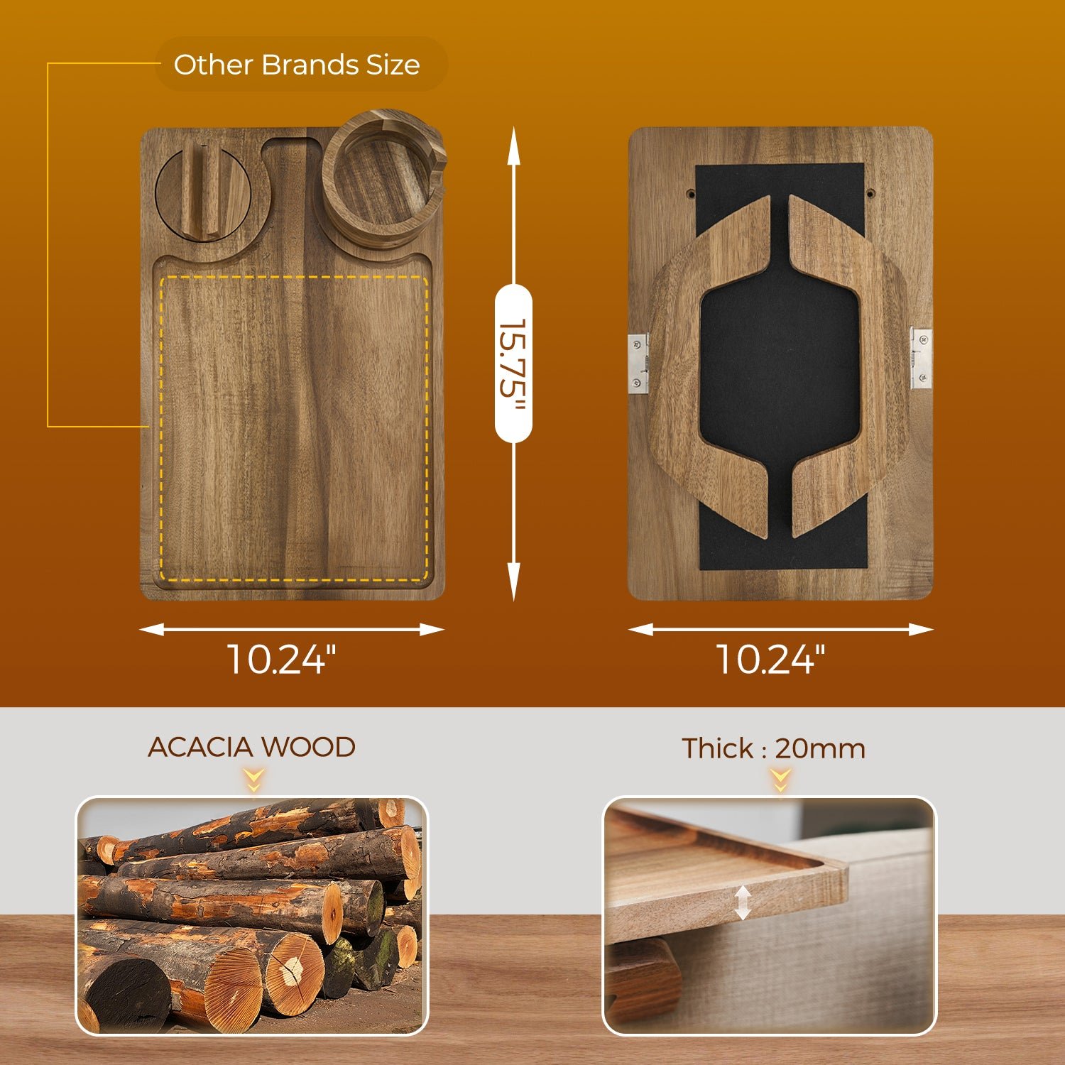 Safety design: The sofa tray table and charcuterie board are made of wooden material, retaining the original wood grain for a stylish and durable look. The material is sturdy, resistant to deformation, and easy to clean. Both surfaces are smooth with no sharp edges, preventing damage to leather sofas and reducing the risk of accidental collisions.